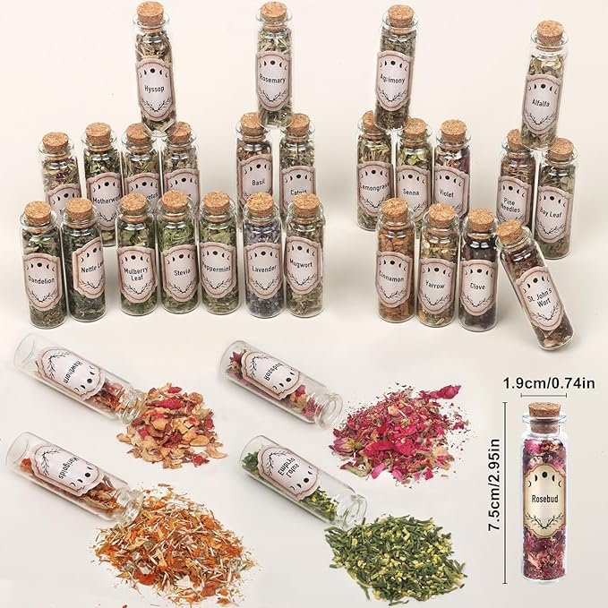 This handcrafted Witchcraft Supplies Kit features thirty organic herbs — including rosemary, lavender, sage, and mugwort — each sealed in its own glass jar for lasting freshness. Perfect for cleansing, blessing, and creative spellwork, it also includes a gold spoon, bell, feather, and parchment scrolls.